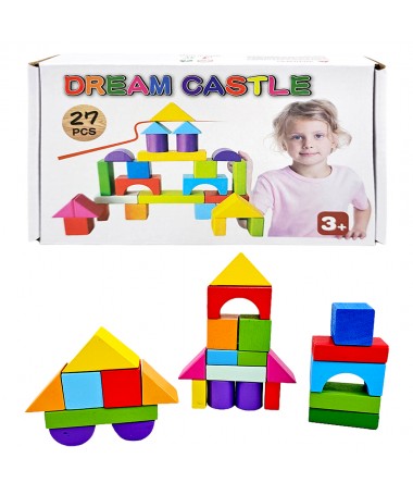Juguete educativo ideal para niños a partir de 3 años. Incluye 27 piezas de bloques de colores brillantes y diferentes formas geométricas que permiten construir castillos, casas, torres y muchas otras figuras creativas.